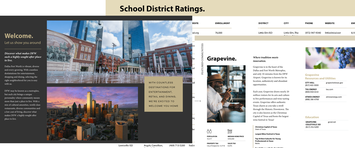 Our free go-to relocation guide provides info, links, and school info on all our cities. See what makes each community unique. Welcome to DFW!